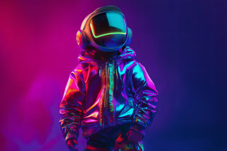 Studio portrait of a child wearing a futuristic metallic outfit and helmet with neon accents, illuminated by vibrant, colorful lighting