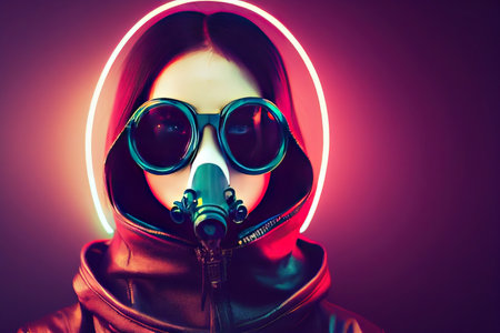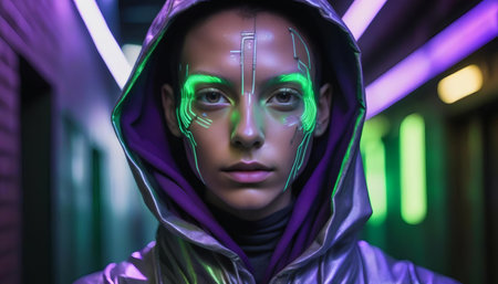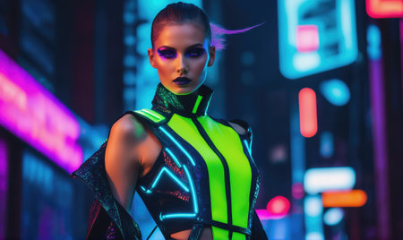 Cyberpunk style portrait of beautiful young woman in futuristic costume.