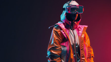 Immerse in the futuristic glow of cyber aesthetics with this striking image of a neon-clad figure in high-tech gear. Captivating and dynamic, it radiates a sci-fi vibe. Generated A.I.