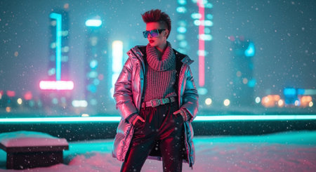 A woman with a distinctive style, wearing a vibrant red jacket with glowing elements and fashionable pink-tinted glasses, exuding a futuristic vibe.