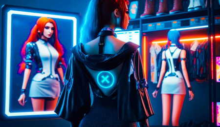 Woman standing in front of mirror with neon light on her back. Generative AI.