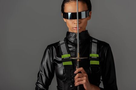 attractive futuristic african american woman in glasses with sword isolated on grey