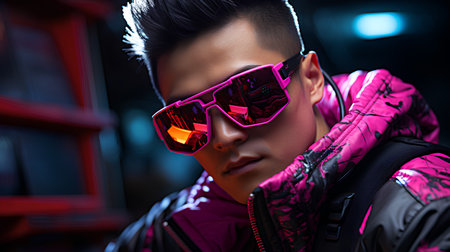 A young man is wearing futuristic VR glasses and a shiny, iridescent jacket, looking forward with a focused expression.