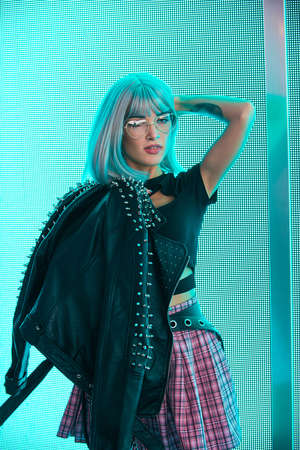 A woman in a silver jacket stands against a wall with purple and blue lighting