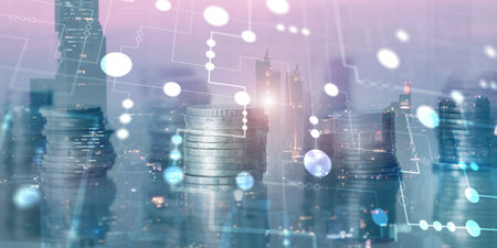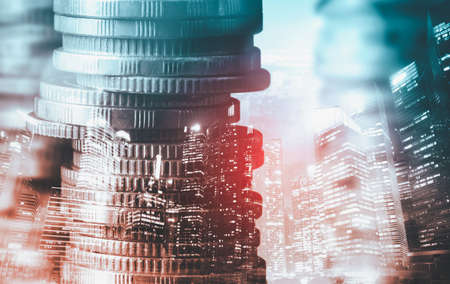 Double exposure of coin stack with city background and world map, financial graph, world map and global network business concept idea, element by NASA.