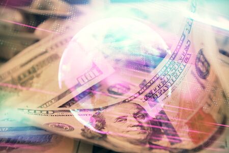 Double exposure of data theme drawing over us dollars bill background. Technology concept.