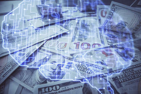 Double exposure of brain drawing over us dollars bill background. Technology concept.