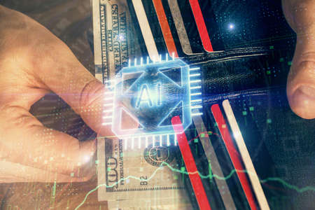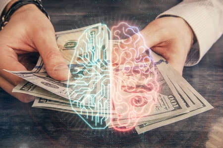 Multi exposure of brain drawing hologram and us dollars bills and man hands. Ai invest concept
