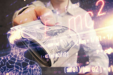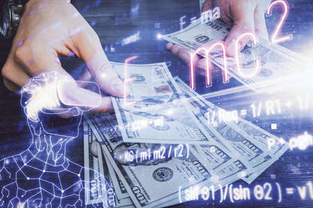 Multi exposure of Formulas drawing hologram and USA dollars bills and man hands. Education