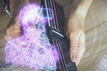 Double exposure of technology drawing hologram and us dollars bills and man hands. Data concept