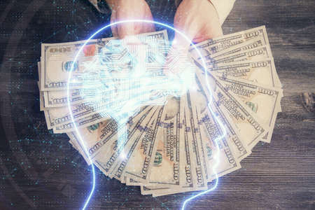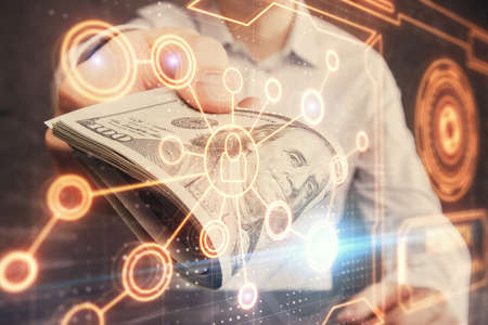 Multi exposure of blockchain theme drawing hologram and USA dollars bills and man hands. Business concept.