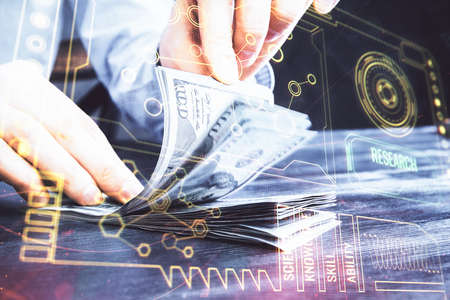 Multi exposure of Tech drawing hologram and USA dollars bills and man hands. Technology concept.