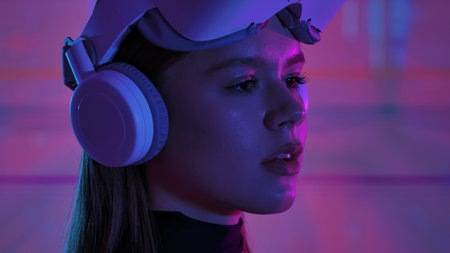 Young woman puts on neon 3d virtual reality glasses.