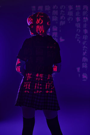 back view of anime woman in school uniform in hieroglyphs projection on blue neon light, subculture