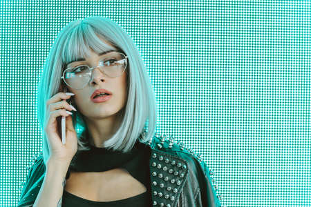 Millennial enigmatic pretty girl with unusual dyed hairstyle near glowing neon wall at night. Blue hair, golden sequins as freckles,nose piercing. Mysterious hipster teenager in glasses