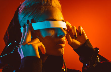 Close up of futuristic woman in holographic smart glasses