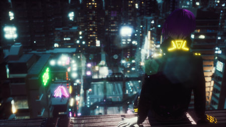A girl sits on the roof of a skyscraper, dangles her legs and admires the neon city of the future. View of an future city. 3D Rendering.