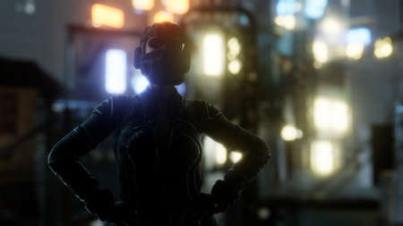 A beautiful cyberpunk girl stands against the backdrop of the night city of the future. Cyberpunk concept. Technology and fashion.