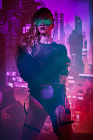 Cyberpunk style portrait of beautiful young woman in futuristic costume.