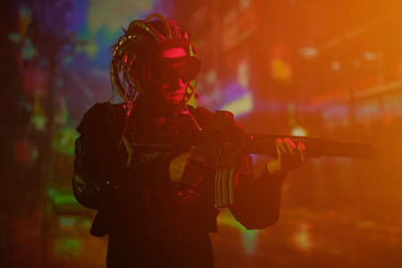 Virtual reality, city of the future. A tech cyber warrior fights with a gun in his hands against the backdrop of the night city.