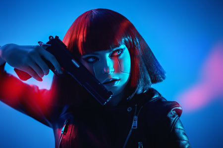 A shot of an attractive cyberpunk girl standing on alert with a gun against a blue background. Sci-fi cyborg soldier girl. Game, virtual reality.