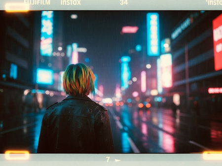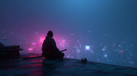 Enchanted Cityscape in Futuristic Anime Style with Mysterious Silhouette and Neon Lights, Concept of Sci-Fi Fantasy and Urban Exploration.
