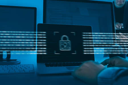 Hand using laptop with digital padlock interface and binary code. Protection and web safety concept