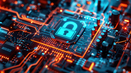 This image features a close-up of a circuit board illuminated with vibrant orange lights, showcasing a lock symbol, symbolizing digital security and technology.