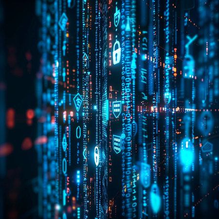 A close-up, abstract view of hexagonal shapes with padlock symbols, illuminated by vibrant neon blue and purple lights.