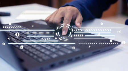 Businessman uses capable laptop computer to manage cyber security system for defending computer virus , computer crime and hackers in order to maintain security of cyber business