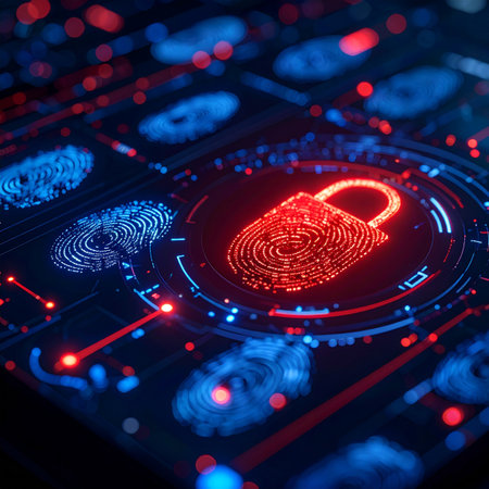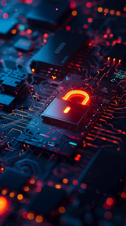 This image showcases a detailed view of a digital circuit board featuring a glowing lock symbol, representing the essential concept of cybersecurity and data protection in technology.
