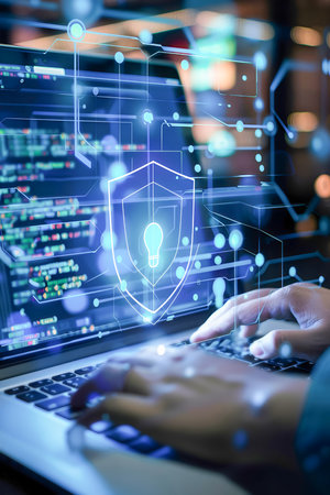 Person working on a laptop with a transparent shield symbol overlay symbolizing data protection