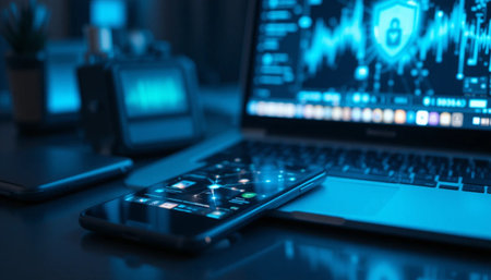 A laptop and smartphone display cybersecurity data, emphasizing digital security and technologys role in protecting information in a connected world.