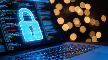 A glowing blue padlock icon superimposed on a laptop screen displaying code, with blurred bokeh lights in the background, symbolizing cybersecurity and data protection.