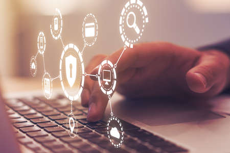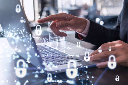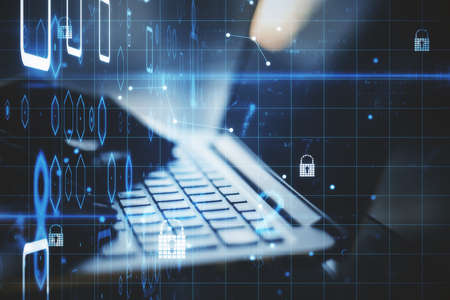Cyber network security concept with digital screen of security icons and symbols and man hand with laptop. Double exposure