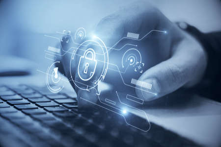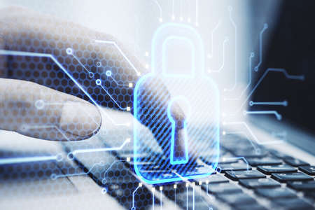 Close up of male hands using laptop keyboard with abstract glowing blue padlock circuit hologram on blurry background. Internet, workplace, information and safety concept. Double exposure