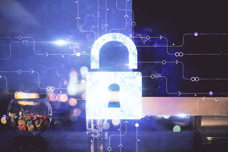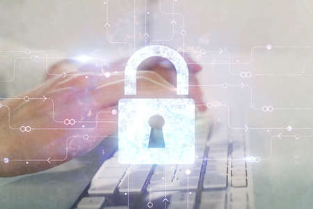 Double exposure of desktop with computer and lock icon hologram. Concept of data safety.