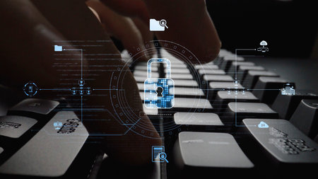 Close-up of hands on keyboard with a glowing padlock overlay, symbolizing data protection, privacy, and online security.