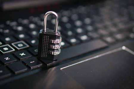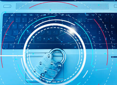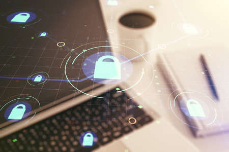 Double exposure of creative lock hologram with chip on laptop background. Information security concept