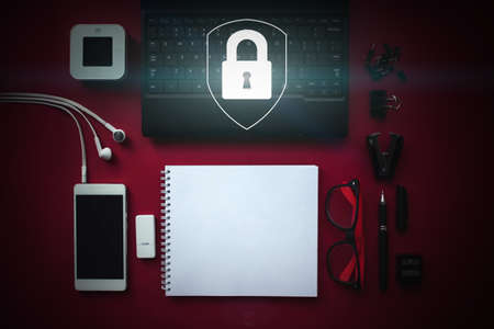 Showing code on laptop screen at home desk with pen over notebook, eyeglasses and lock overlay. Cybersecurity, technology, innovation, protection, data, digital, concentration