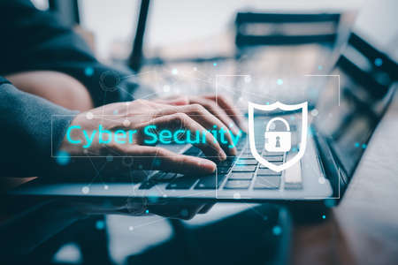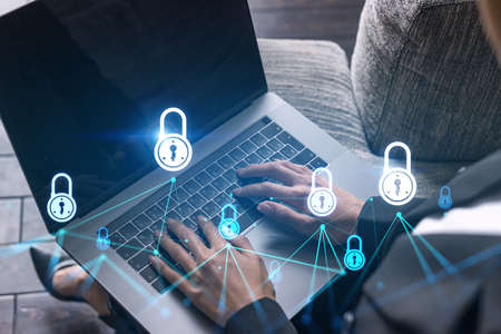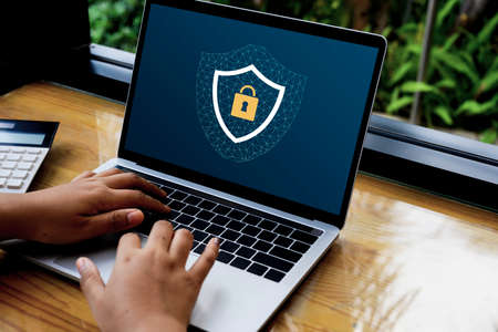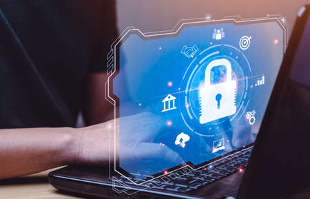 Person using a laptop computer with technology cybersecurity and privacy concept. protection and safe data for global network security.