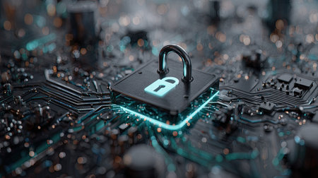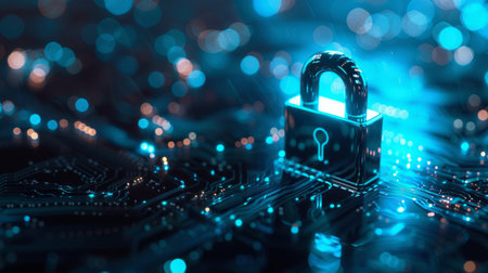 A digital padlock on a circuit board, symbolizing cybersecurity and data protection