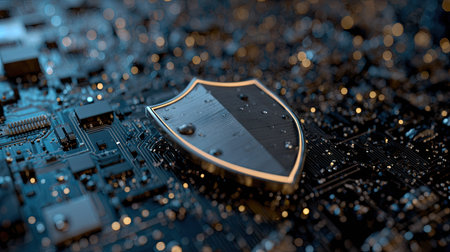 Cyber security concept. Shield on computer circuit board. 3d illustration