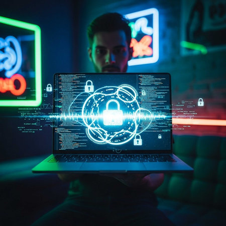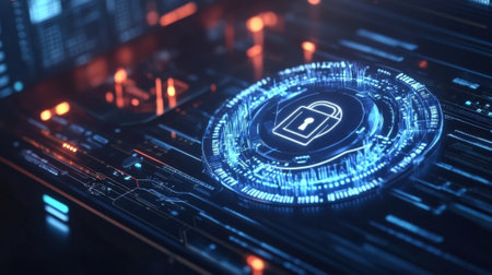 A detailed closeup of a holographic data shield hovering above a computer workstation showcasing animated locks and shields that signify advanced encryption ods. The interface pulse