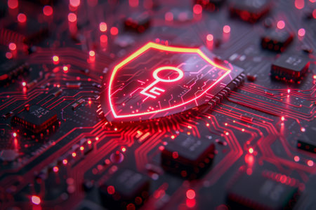 A luminous padlock on a shield symbolizes robust cybersecurity, set against a sleek, high-tech network backdrop evoking advanced digital protection.