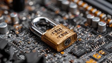 Detailed close-up view of a padlock resting on a computer circuit board, representing themes of digital security, data protection, and privacy in technology.