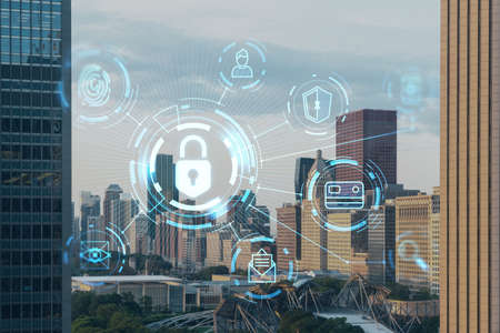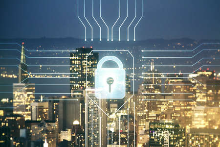 Lock icon hologram on city view with skyscrapers background multi exposure. Data security concept.