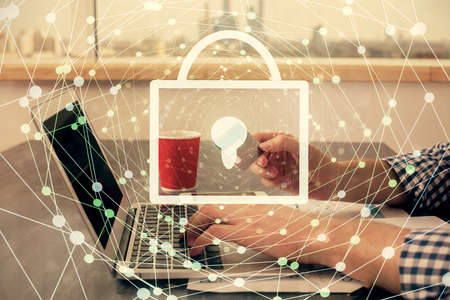 Businesswoman typing on computer in office. Lock icon hologram. Security concept. Double exposure.