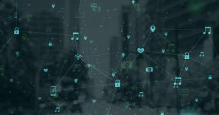 Digital composite image of Network of connection glowing green icons over cityscape against grey background. Global networking and connection concept