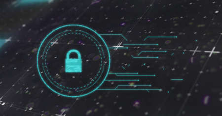 Light trails over security padlock icon against white particles on black background. cyber security and technology concept